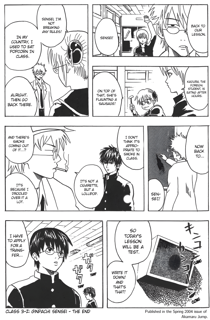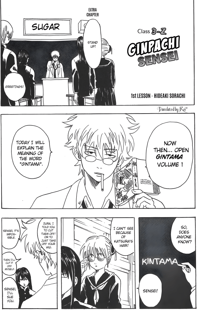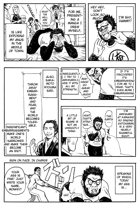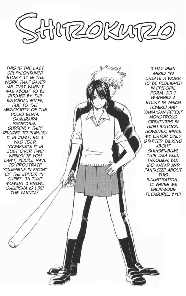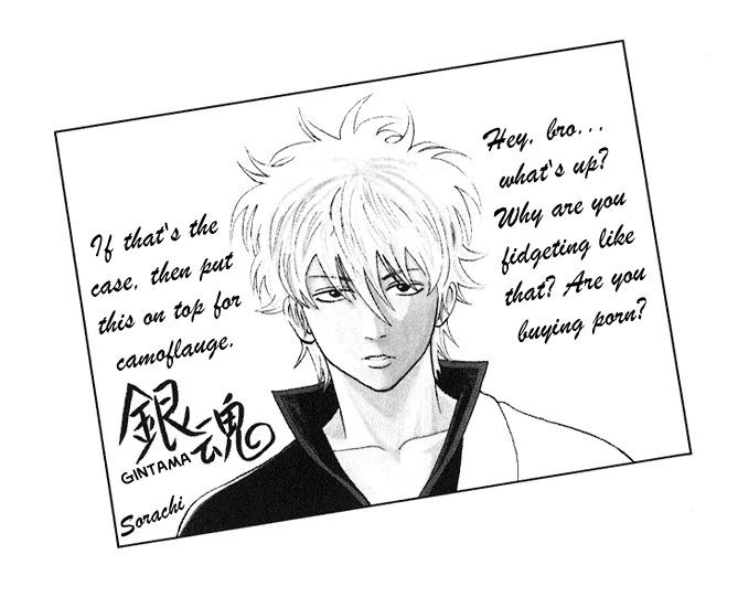 Since there’s a lot in volume two that everyone should apologize for, I want to do so as well… Apparently a lot of people complained saying, “Because of the obscene title, Gintama, which links to Kintama, meaning ‘balls’, I can’t buy the volume, you damned gorilla!” … I’m really sorry!