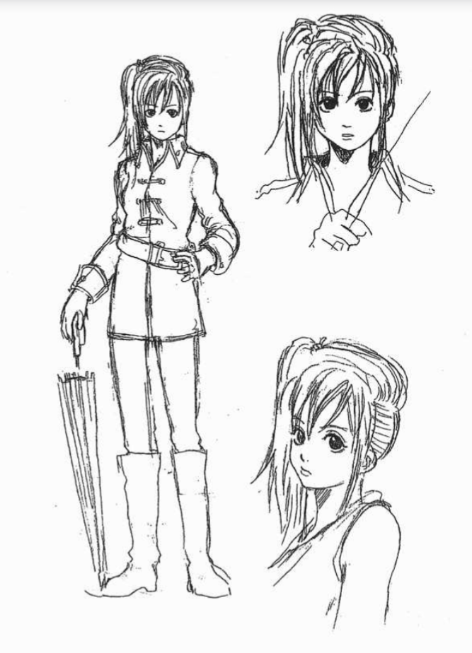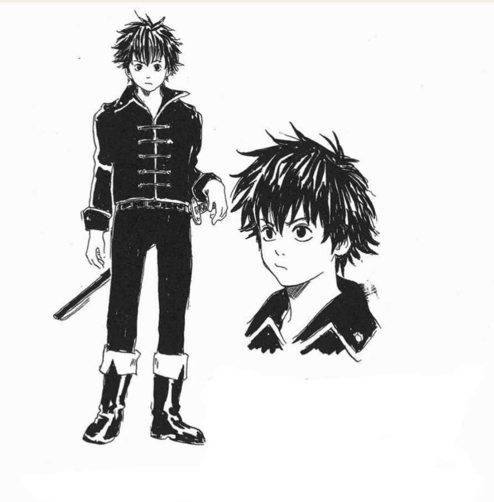 This is Okita… She must have been a woman at first. She was like Otsu, and her ability to fight with an umbrella was inherited from Kagura. Since at some point I realized that the Shinsengumi were all middle-aged men, devising desperate measures, I decided to create this grumpy character. By the way, Kagura was also supposed to be as big as her, but my editor dismissed that idea saying, “She’s not very pretty… make her smaller!”…
