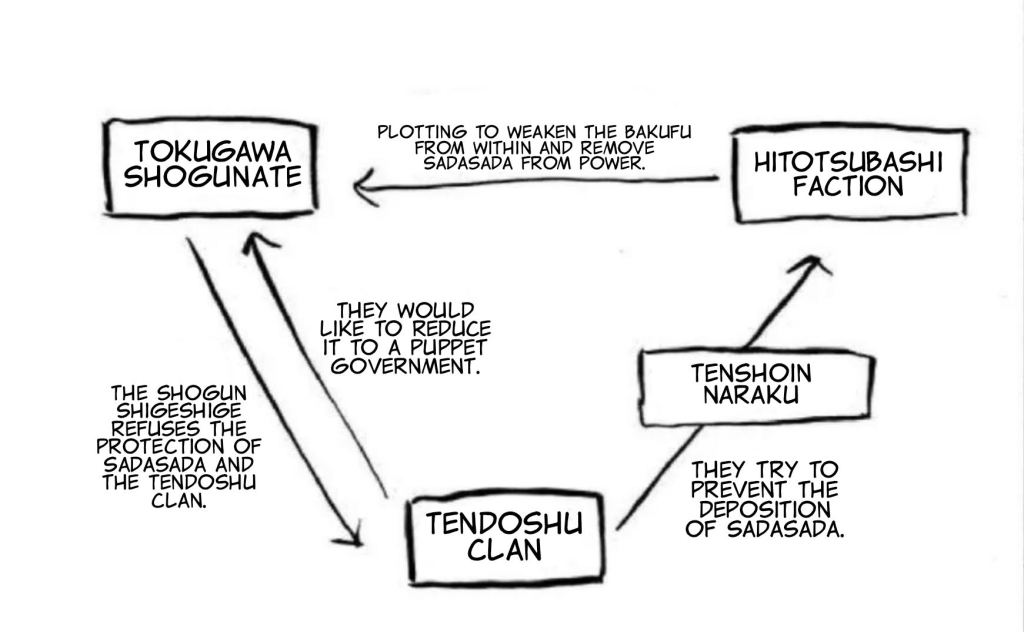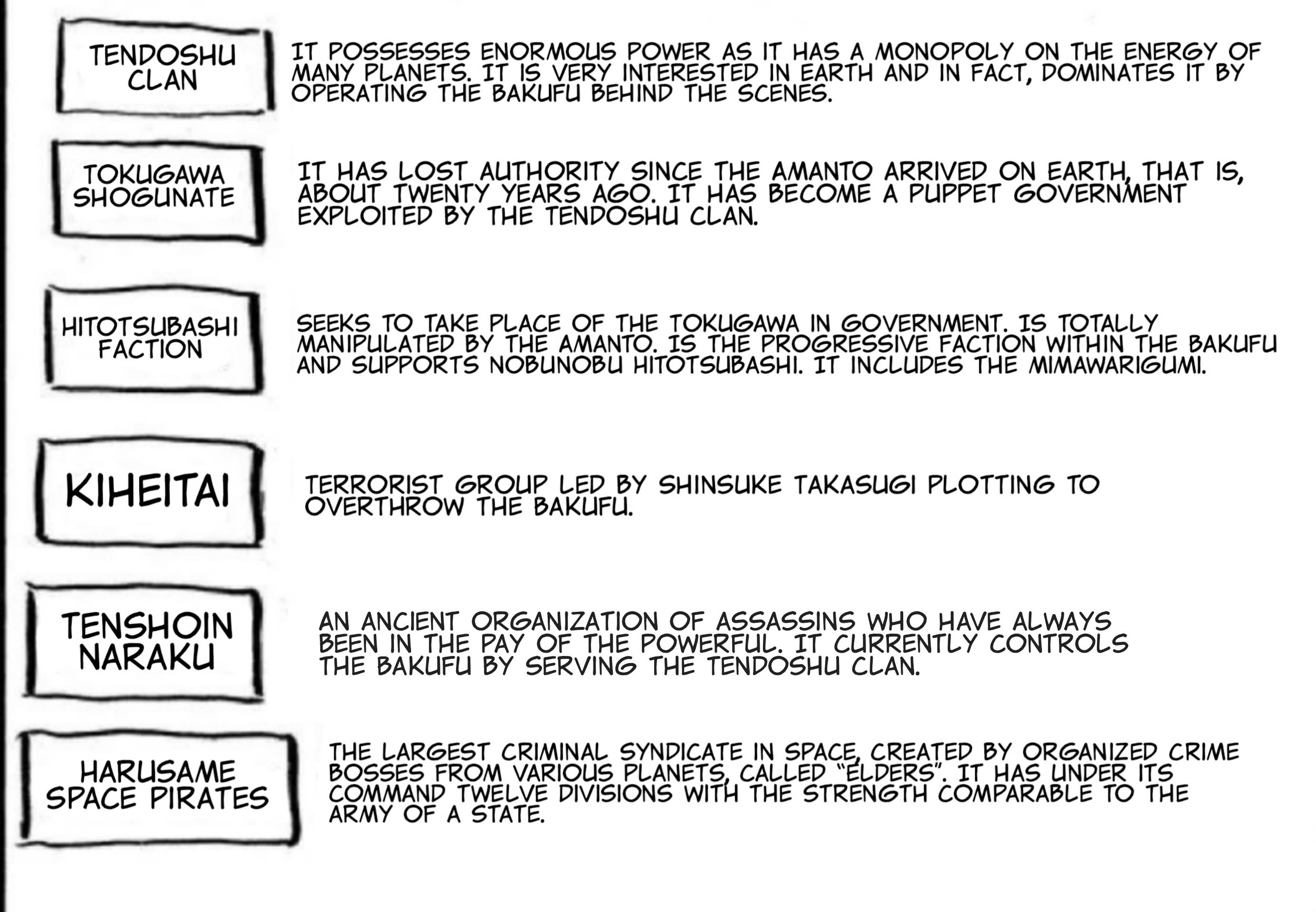 The pattern of initial correlations between the various groups is more or less like this. The Tokugawa Shogunate (Bakufu), which has become a puppet government, is loathed both by those within and outside it. The patriots campaigning against foreigners aim to overthrow it because they cannot accept the country being in the hands of such a government. Within the Bakufu, the anti-Shigeshige faction plotted in the shadows to wrest power from the Shogun Shigeshige Tokugawa, while the Hitotsubashi faction increased its authority. Taking advantage of this situation, Shinsuke Takasugi approaches Isaburo Sasaki, the director of the Mimawarigumi who is part of the Hitotsubashi core, and allies himself with him to destroy the government; at the same time he makes contact with the Harusame space pirates, the largest criminal syndicate in space, to increase his strength and exploit their power.