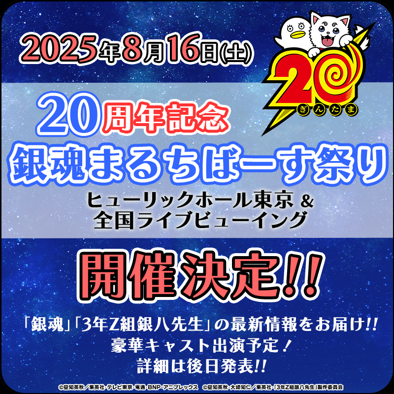A new Gintama festival, 20th Anniversary Gintama Multiverse Festival, has been announced and will be held on August 16, 2025 (Saturday), at the Hulic Hall in Tokyo. This marks the first festival held ever since the Gintama Ato no Matsuri festival in 2023. This time around however, the festival, as its name implies, will not only focus on the Gintama series, but also its spinoff 3nen Zgumi Ginpachi Sensei, which will be airing in October 2025. The event will be featurting a star studded cast, and will be delivering information on both series.