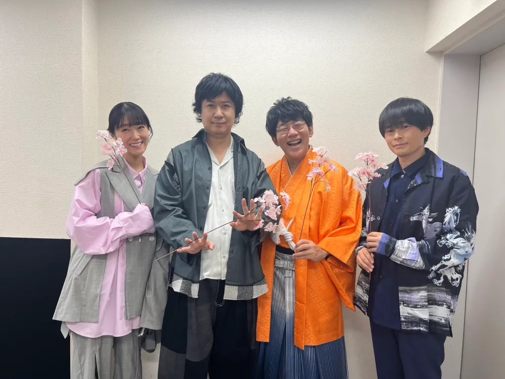 The stage greeting was held today in Shinjuku Wald 9 in Japan, featuring Tomokazu Sugita (Gintoki), Daisuke Sagakuchi (Shinpachi), Rie Kugimiya (Kagura) and Yuki Ono (Shigeshige) who appeared on the stage. It began with the Yorozuya voice actors beginning their conversation in the traditional, background-only interaction. They were then told by the staff that a guest was joining in, and after the three of them tried guessing who it would be, the shogun, Tokugawa Shigeshige was shown on the screen. Around that same time, his voice actor, Yuki Ono, appeared on the stage dressed just like the Shogun. Gintoki and Shinpachi yelled in unison, “Shogun kayoooooo”, much to the ever rising amusement of the audience. In the midst of the applause, Sugita, Sakaguchi and Kugimiya all joined Ono on the stage. Sugita commented saying “The four seasons have disappeared so much that we can no longer say summer or spring. However, today’s cherry blossoms are in full bloom”, leading the audience to applaud loudly. Ono’s famous line “I’ve missed you, my friends” brought further excitement to the audience as well.