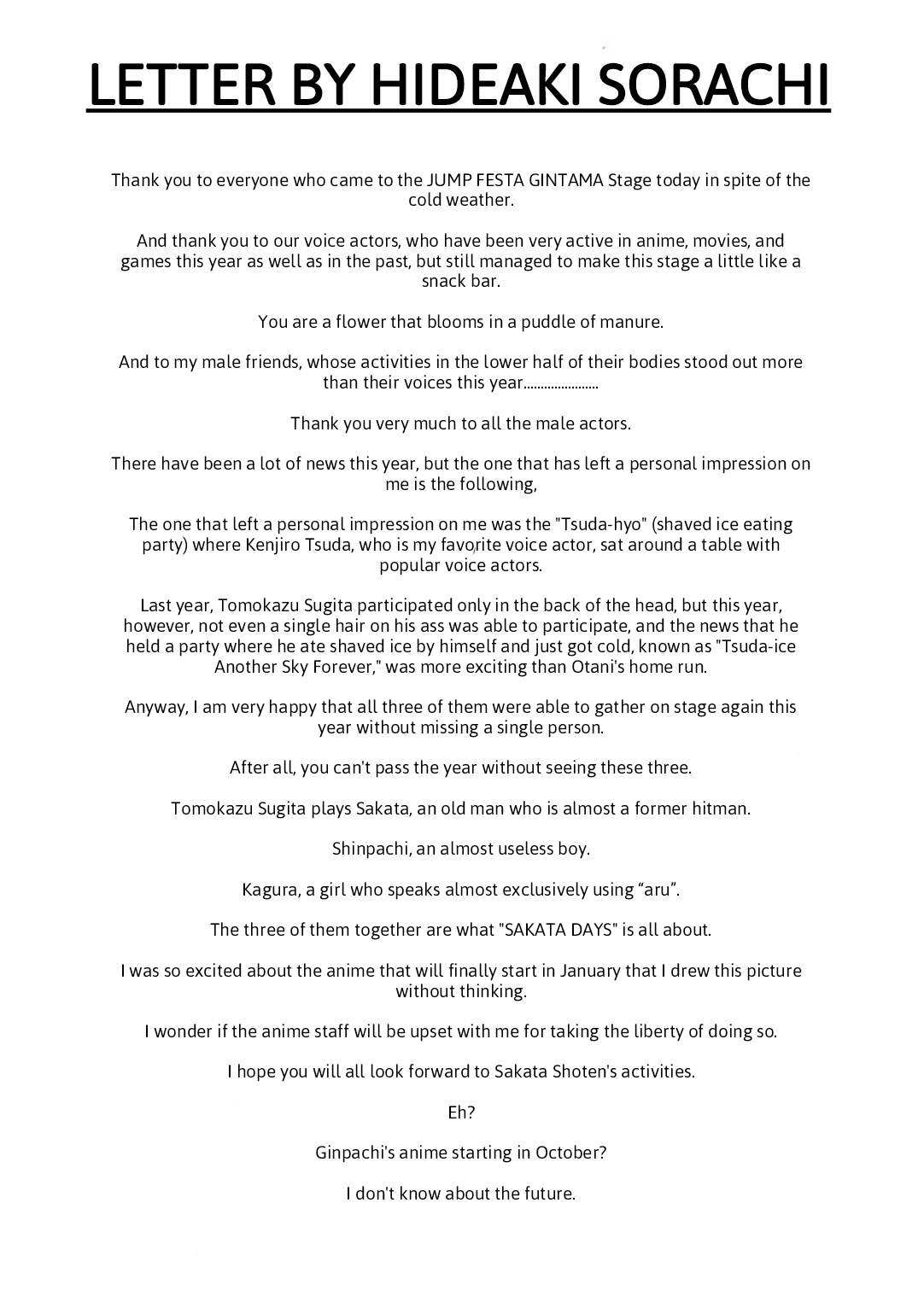 As shown, Sorachi is showing love and support to the upcoming adaptation of the SAKAMOTO DAYS anime, which shares a couple similarities to Gintama, has Sugita voice the main character, and will air on January 11, 2025, by parodying the first volume of the manga, using Gintoki, Shinpachi & Kagura and renaming it “SAKATA DAYS”.