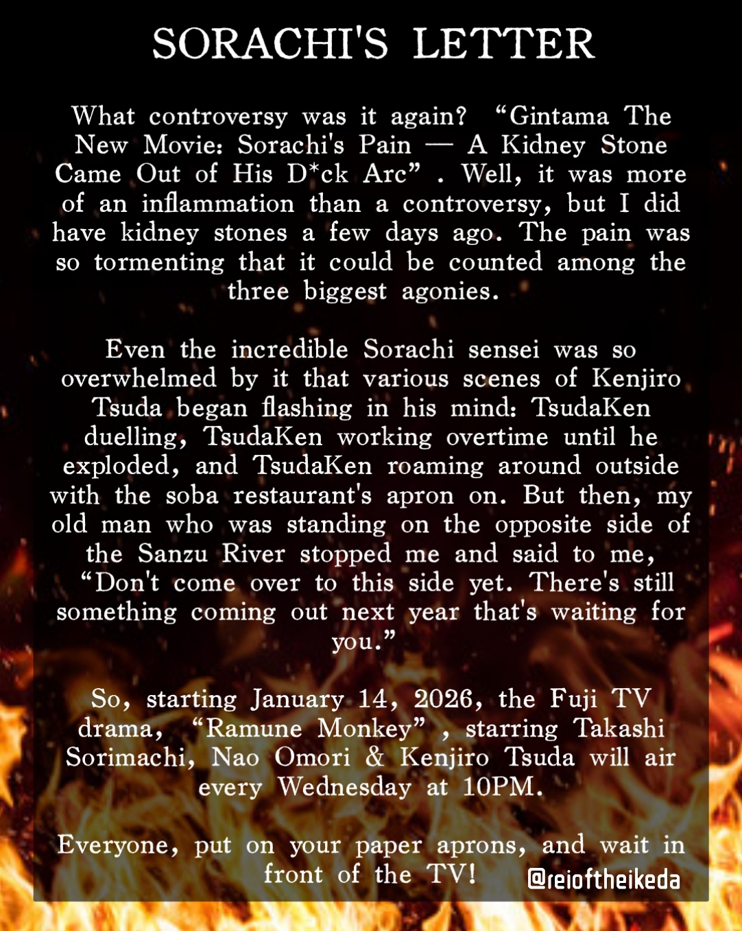 The crew looked back at the Ginpachi Sensei anime, which will end on Monday, and ended the first segment with Sugita telling fans to make sure to watch it. The crew then quickly changed attires, and began the following segment which focused on the upcoming Yoshiwara movie.
