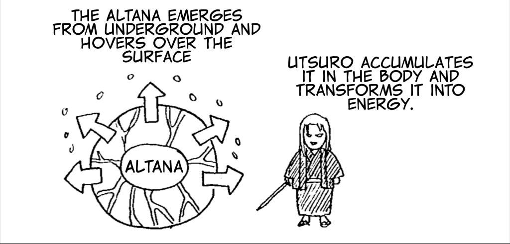 In this volume, the Altana pours out in spurts on the earth’s surface because Utsuro made it lose control, but also normally it comes out little by little and remains suspended in the air (see the little drawing above). Immortal individuals like him incorporate it by converting it into life energy, so they can keep moving practically non-stop. Kouka, on the other hand, had moved away from her energy source, so she could not replenish it, but even if she could, the planet Koan was dying, and her Altana was almost completely exhausted. For this reason, she chose to die as an ordinary human being, close to her family. Utsuro, on the other hand, has an extraordinarily large Altana reserve tank in his body, so even if he temporarily moves away from Earth, his supply is not easily depleted. During the fight against Umibozu he ended up using it up completely, but since the Earth is still healthy and strong, all he had to do was return to it to accumulate new energy.